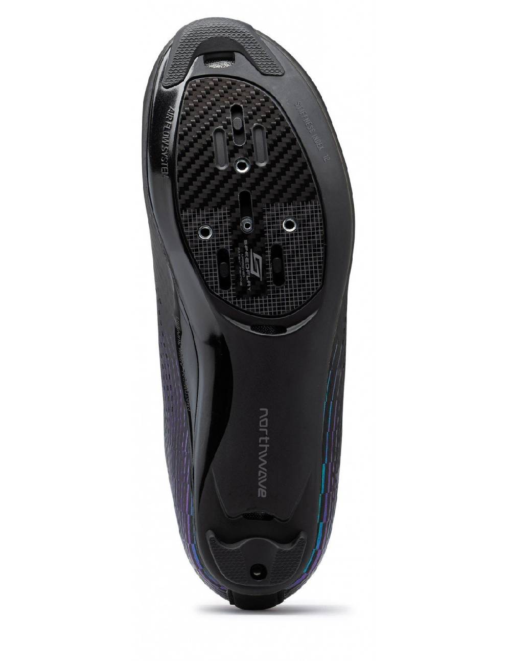 Suola Morph Carbon 12 AAS con inserto 100% in carbonio nella zona del pedale e indice di rigidità 12.0. L'esclusivo Anatomical Arch Support®, in TPU, permette alla scarpa di modellarsi perfettamente sull'arco plantare, rendendo la suola ideale per ogni tipo di piede