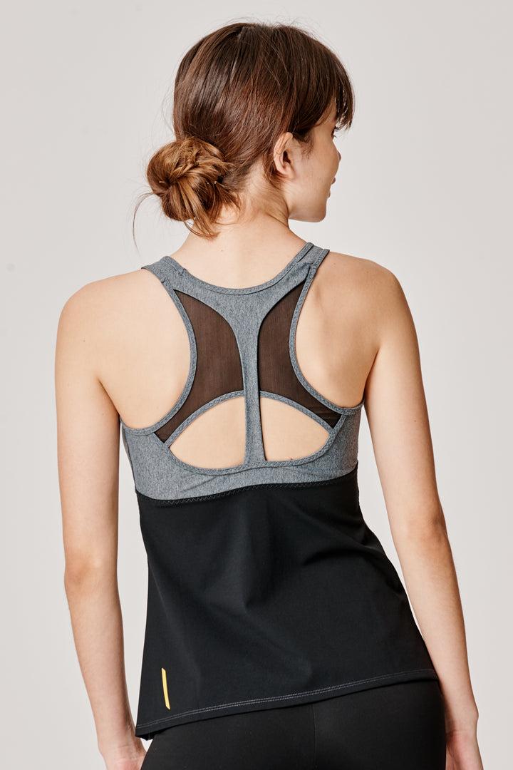 Canottiera sportiva realizzata in abbinamento di nero frontale e rosa posteriore, con giro ascella ampio e schiena all'americana con dettaglio in rete che la rendono con indumento d'ispirazione streetwear da indossare sopra ad un reggiseno a vista.