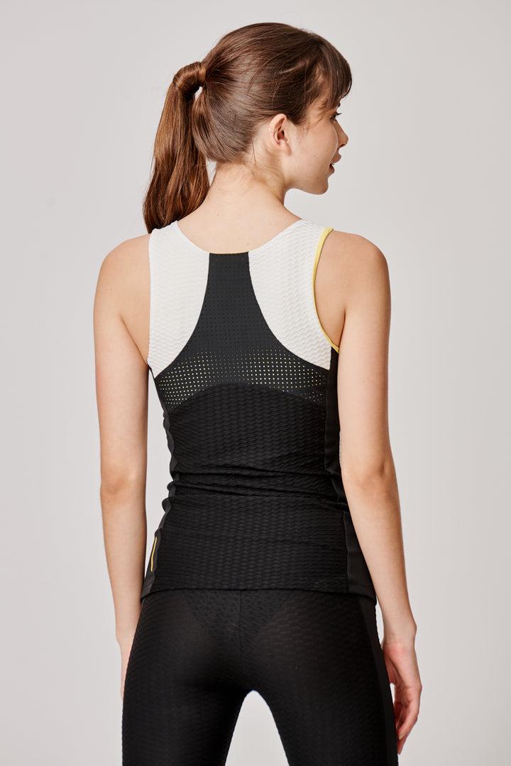 Canotta sportiva in tessuto tecnico testurizzato 3D con pannello in rete sul retro per la massima traspirabilità, disponibile nella combinazione color blocking firma Sàpopa di bianco, nero e giallo.