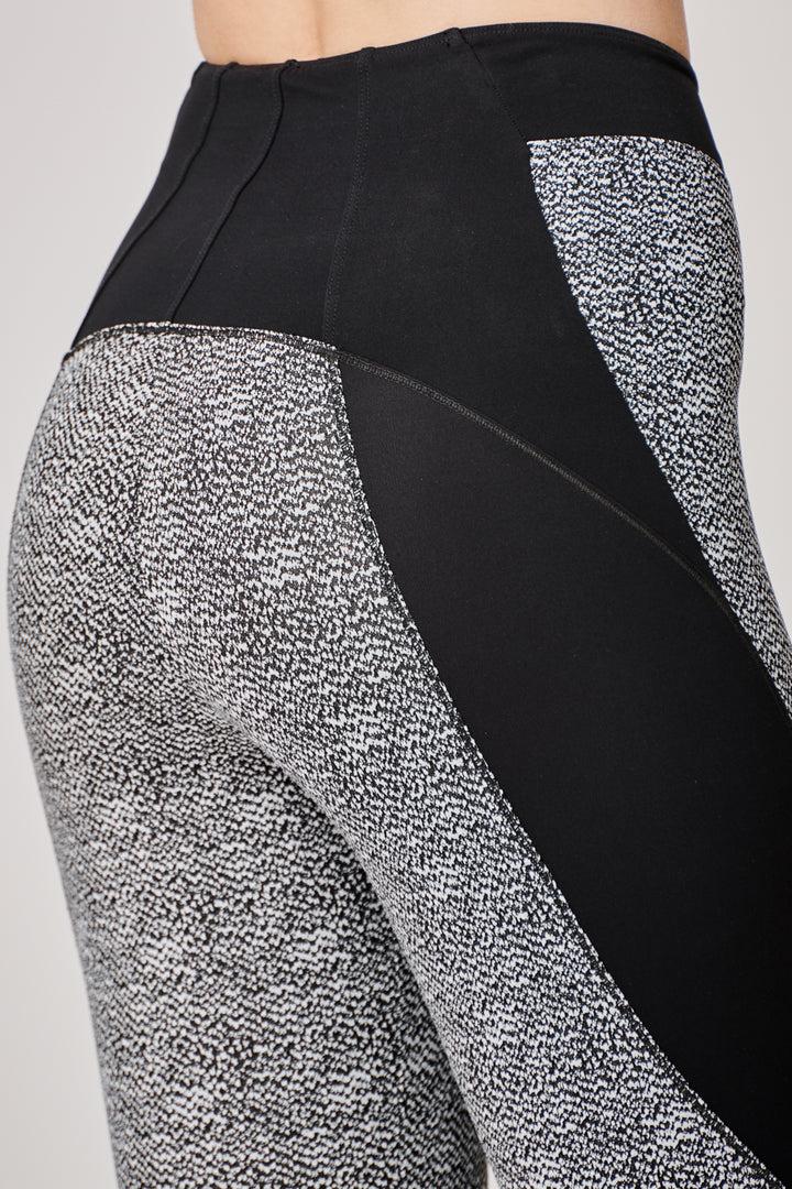 Leggings sportivi 3/4 in una combinazione di tessuti stretch e pannelli a contrasto stampa e tinta unita, studiati per lavorare in sinergia con il corpo favorendo la micro circolazione ed assorbire il sudore.